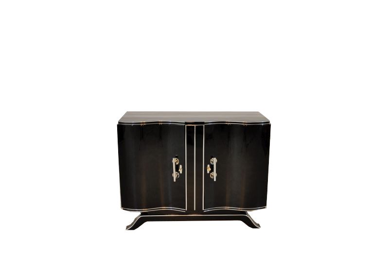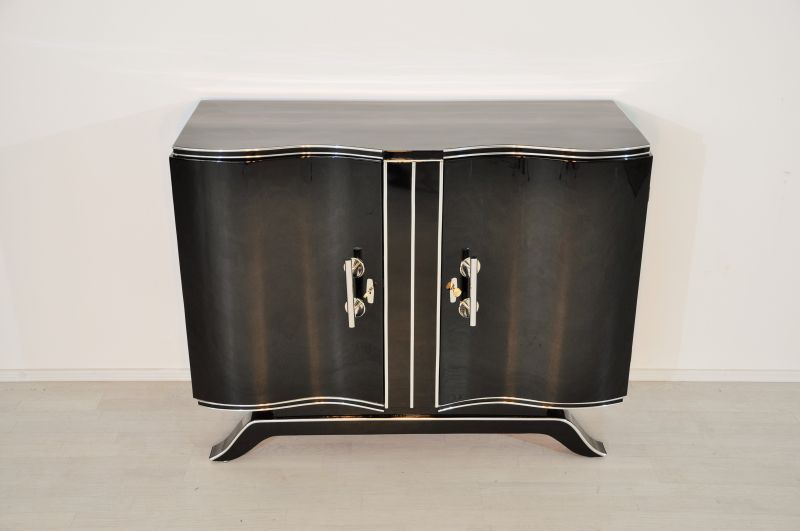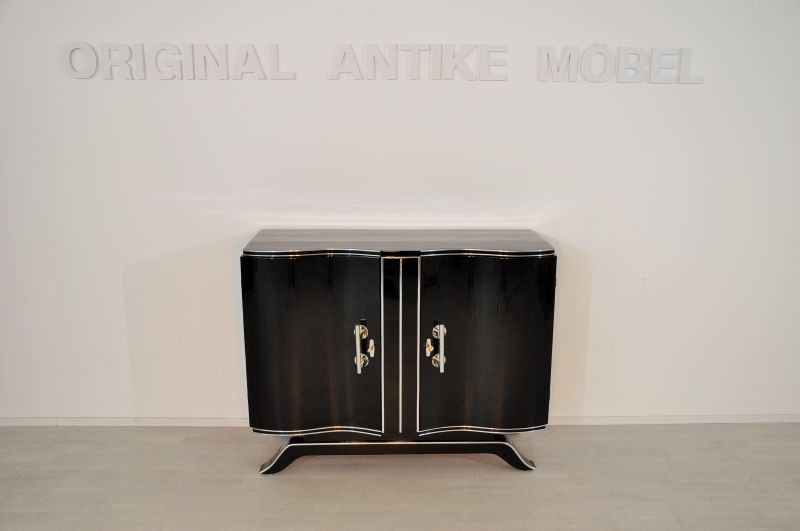 Original commode from the Art Deco era with wonderful curved doors and plenty of storage space. Costly restored Mahogany – Interior with the original color scheme, exterior lacquered and polished in high gloss black. Features two amazing serpentine wing doors. An absolute eyecatcher in every apartment!