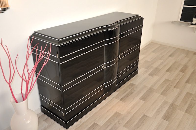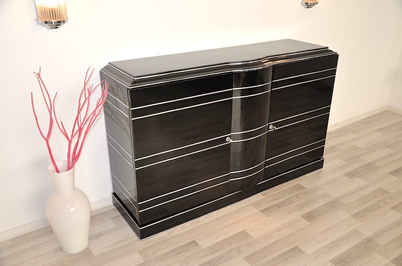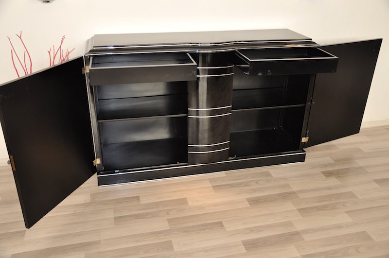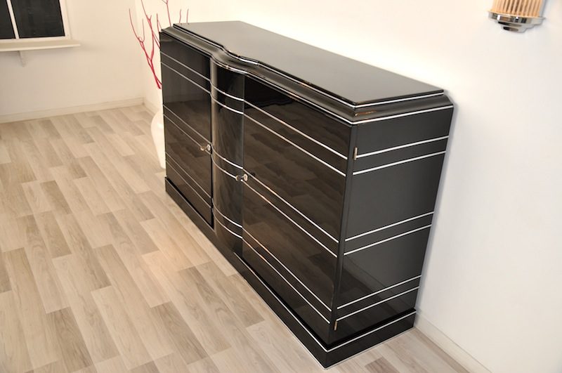Art Deco style sideboard with elegant chrome bars. A unique design piece with a high gloss finish on the outside and a matt black finsih on the interior. With two shelves and two drawers and a wonderfully curved body. With a narrow frame perfect for small halls or walkways. Available with a blackened cut glass plate on top for additional protection.